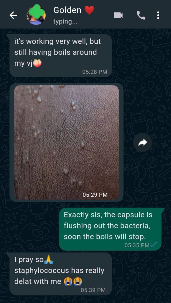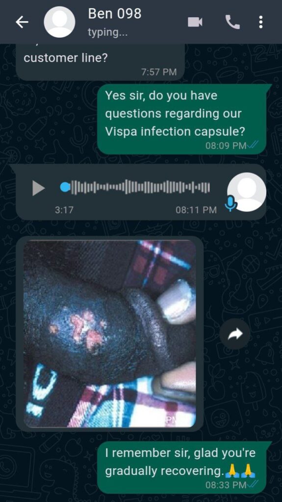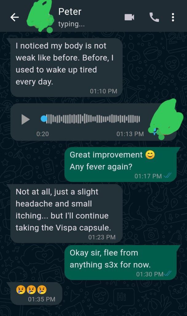 “I thought I would die from this staph disease because it affected my sperm count and sperm motility rate, lol. Fear every day. After using Vispa for 3 Weeks, I felt free and restored, still using it, hopefully after the last bottle, it will go forever.”~Judith